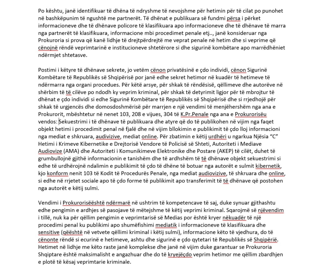 Organi i akuzës së Tiranës kërkon nga mediat që të mos publikojnë asnjë informacion nga rrjedhja që erdhi si pasojë e hakerimit. Në të kundërt, prokuroria paralajmëron se do të veprohet sipas ligjit.