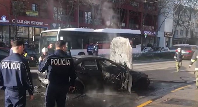 Një makinë është përfshirë nga flakët dhe për pasojë është shkrumbuar plotësisht në rrugën e Dibrës në Tiranë.