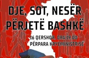 “Dje, sot, nesër, përjetë bashkë”, kjo është thirrja që po bëhet në rrjet drejtuar qytetarëve, ku ju kërkohet që të bashkohen ditën e premte në orën 19:00 para kryeministrisë për të protestuar në mbështetje të Kosovës. Deklarata e kryeministrit Edi Rama, anulimi i mbledhjes së dy qeverive janë kritikuar nga opinioni publik, prandaj në një … Continue reading “Dje, sot, nesër, përjetë bashkë”/ Të premten, protestë para Kryeministrisë në mbështetje të Kosovës