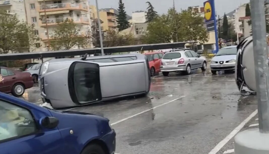 Momente të pabesueshme kanë përjetuar banorët e Ksanthit kur kanë parë makina të përmbysura në mes të rrugës si pasojë e stuhisë me reshje dhe erë të fortë, sipas mediave.