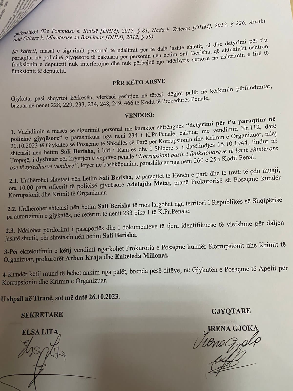 Gjykata e Posaçme e Shkallës së Parë për Korrupsionin dhe Krimin e Organizuar me vendimin e datës 20.10.2023, caktoi ndaj shtetasit nën hetim Sali Berisha, masën e sigurimit personal “Detyrim për t’u paraqitur në policinë gjyqësore” parashikuar nga neni 234 i K.Pr.Penale dhe “Ndalim i daljes jashtë shtetit” parashikuar nga neni 233 i K.Pr. Penale, si i dyshuar për kryerjen e veprës penale “Korrupsioni pasiv i funksionarëve të lartë shtetërorë ose të zgjedhurve vendorë”, kryer në bashkëpunim, parashikuar nga neni 260 e 25 i Kodit Penal.