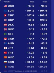Ditën e sotme dollari amerikan blihet me 97.6 lekë dhe shitet me 98.6 lekë. Euro blihet me 104.2 lekë dhe shitet 104.9 lekë. Franga zvicerane blihet me 107.4 lekë, ndërsa në shitje është me 108.8 lekë. Paundi britanik blihet me 118.8 lekë dhe shitet me 120.5 lekë.