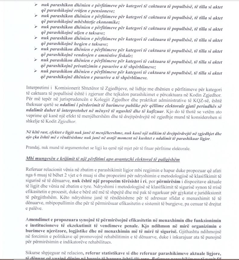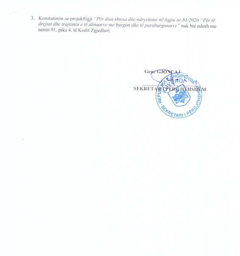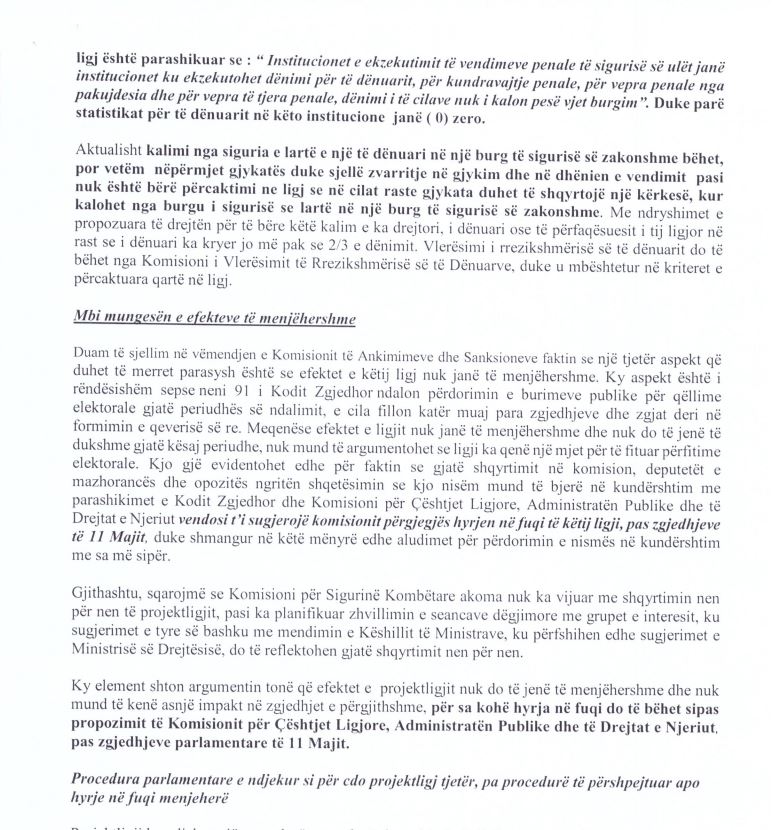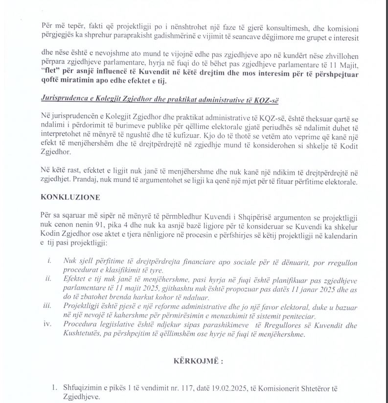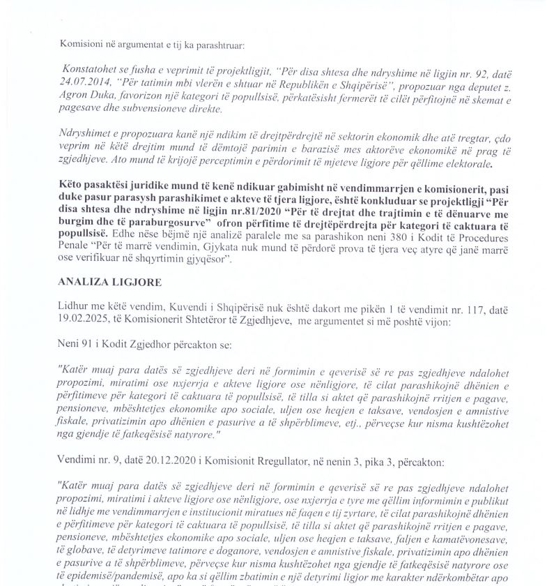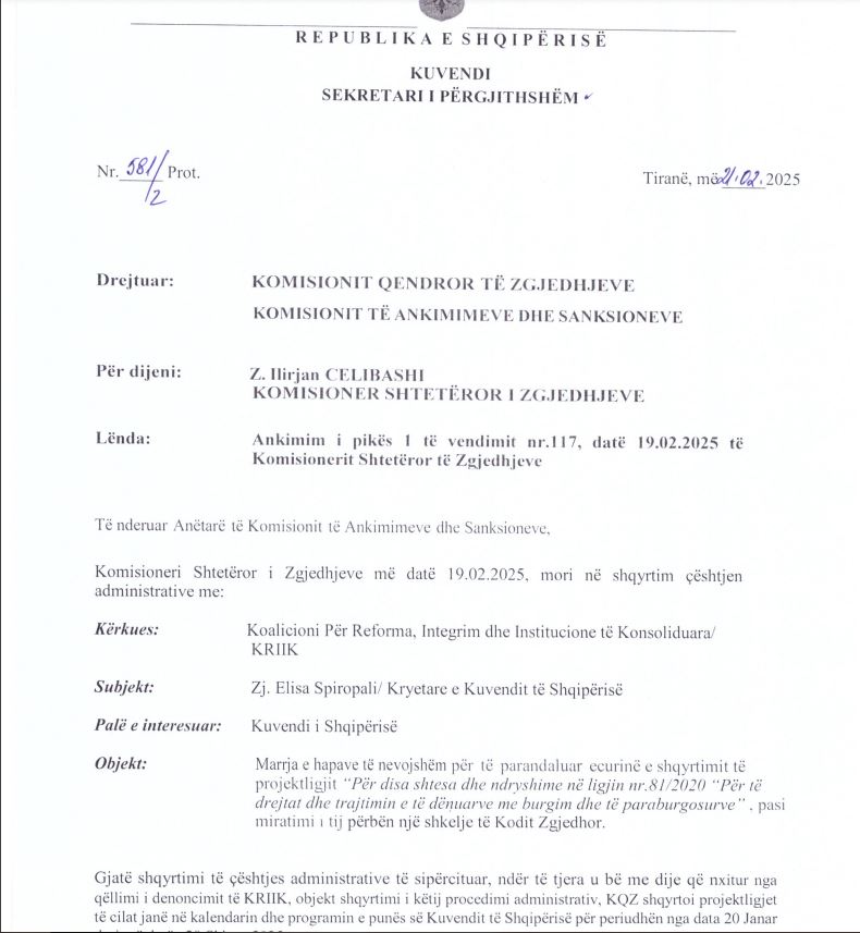 KQZ e ka bllokuar këtë projektligj duke argumentuar se mund të ketë ndikim në zgjedhje, por Kuvendi ka kundërshtuar dhe ka dorëzuar ankimim në Komisionin e Ankesave dhe Sanksioneve (KAS), duke theksuar se nuk ka lidhje të drejtpërdrejtë me zgjedhjet. Për këtë çështje, shorti ka caktuar Ilirjan Rusmalin si relator të ankimimit të Kuvendit.