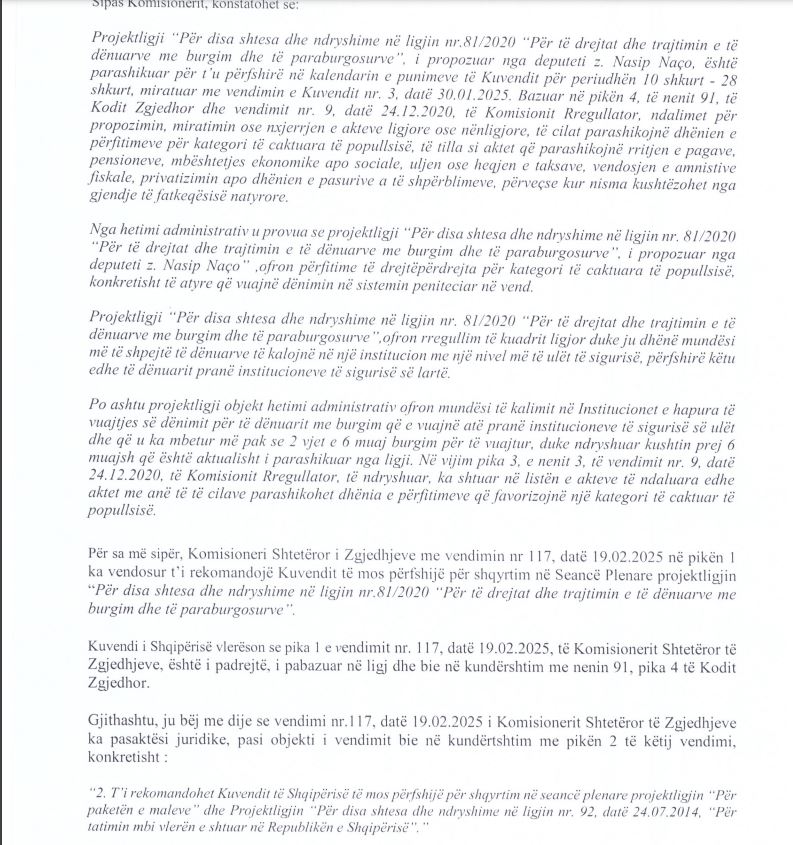 Kuvendi i Shqipërisë ka apeluar vendimin e Komisionit Qendror të Zgjedhjeve (KQZ) që bllokoi projektligjin për “burgjet e hapura”, i propozuar nga deputeti Nasip Naço. Ky projektligj parashikon kalimin e të dënuarve në burgje të hapura, një masë që është shqetësuar për ndikimin e mundshëm elektoral, pasi mund të favorizojë një kategori të caktuar të popullsisë në periudhën e zgjedhjeve të 11 majit.