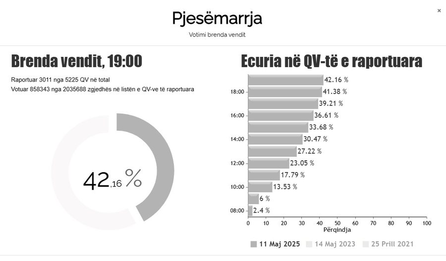 Sipas shifrave deri në orën 19:00 kanë votuar rreth 42.16%. Gjithashtu sipas të dhënave kanë mbi 1.6 milionë shqiptarë.