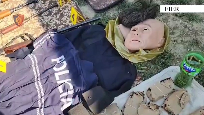 2 radio si të Policisë, 2 uniforma policie, 1 maskë plastike me paruke;