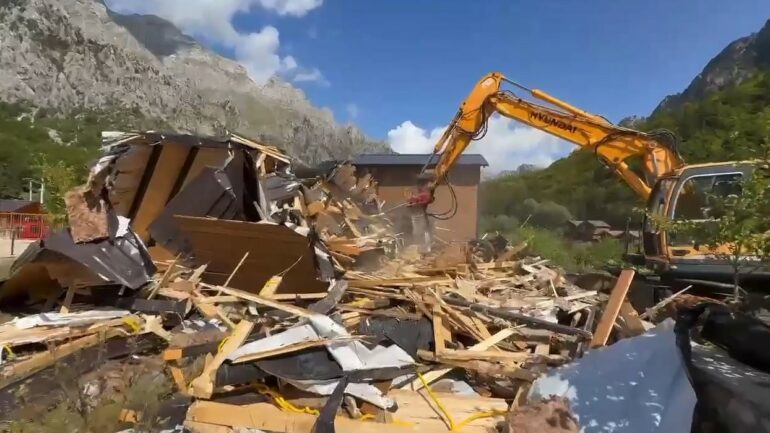 Inspektorati Kombëtar i Mbrojtjes së Territorit po vijon edhe sot aksionin për prishjen e ndërtimeve pa leje në Luginën e Valbonës. Në total janë planifikuar 22 objekte për shembje. Deri tani, 3 objekte janë shembur nga IKMT, 16 struktura druri po çmontohen nga vetë banorët, 3 të tjera mbeten ende në listë.