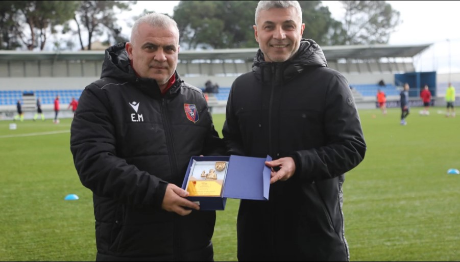 Edi Martini e mori trofeun e Trajnerit më të mirë të Muajit nga tekniku i Kombëtares shqiptare U21, Alban Bushi, pak çaste përpara fillimit të sfidës mes Vllaznisë dhe Vorës.