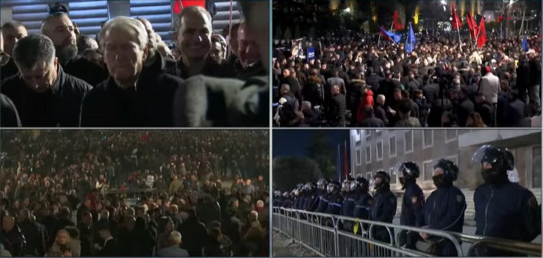 Kreu i PD-së Sali Berisha ndodhet poshtë Kryeministrisë, i shoqëruar nga eksponentët më të rëndësishëm demokratë dhe simpatizantët. Pa podium, në protestën e sotme vihet re që kryedemokrati dhe drejtuesit e tjerë të PD-së kanë hequr kollaren dhe duket se janë përgatitur për një marshim të gjatë.