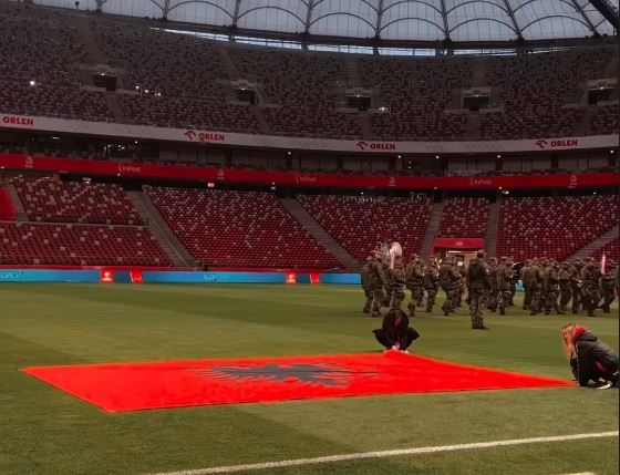 Dy orë para fillimit të takimit, stadiumi “PGE Narodowy” është mbushur me emocion, ndërsa ushtria polake ka zbarkuar për të ekzekutuar himnet kombëtare përpara ndeshjes.